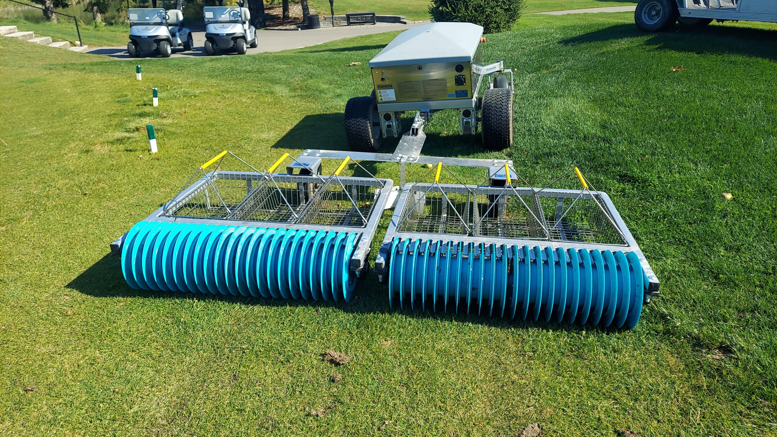 This Canadian-designed and manufactured golf ball picker is modular, and can be configured in the field from 1 up to 5 gangs, and comes with a quick-disconnect hitch for ease of use.